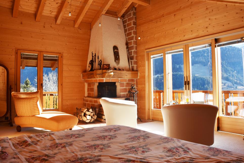 - Spacieuse suite parentale avec cheminée sublime donnant sur un large balcon en angle. Vue sur les montagnes magnifique